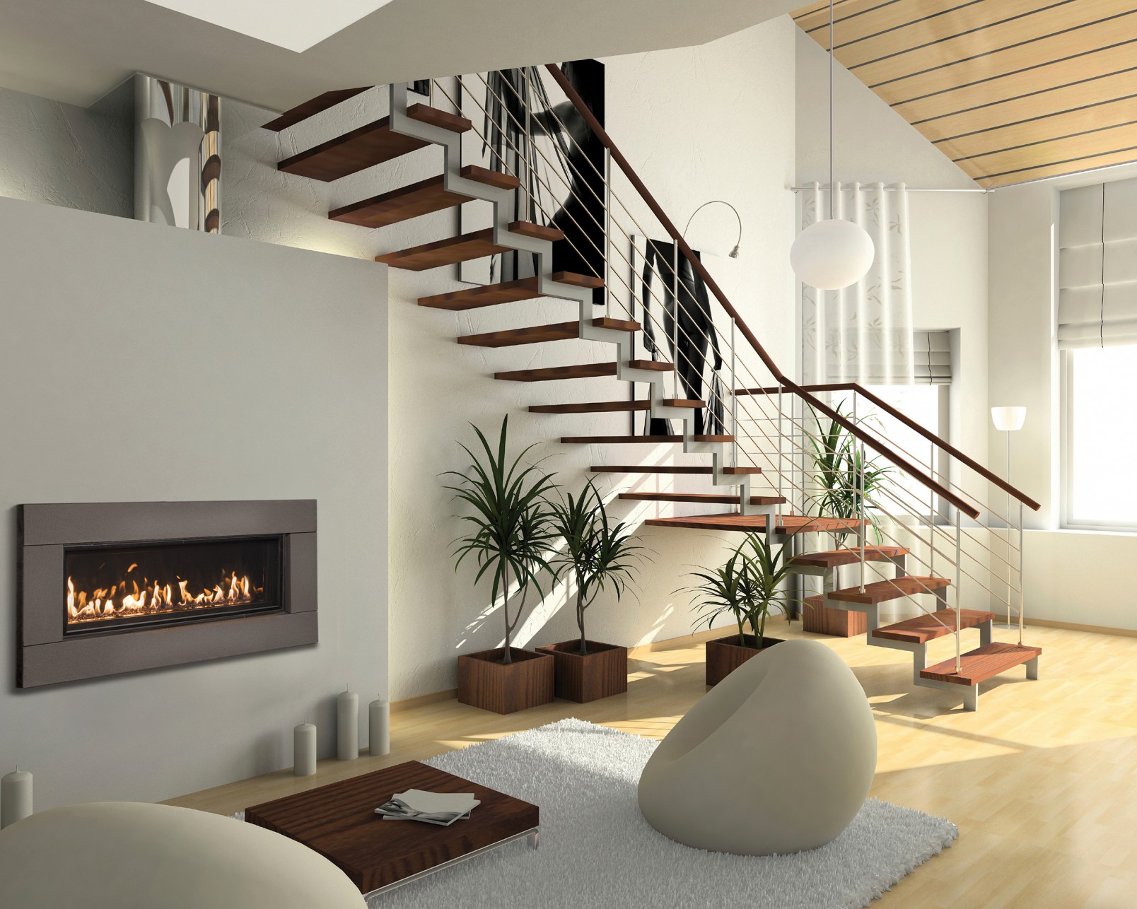 - Fireplace visual composition and wall design